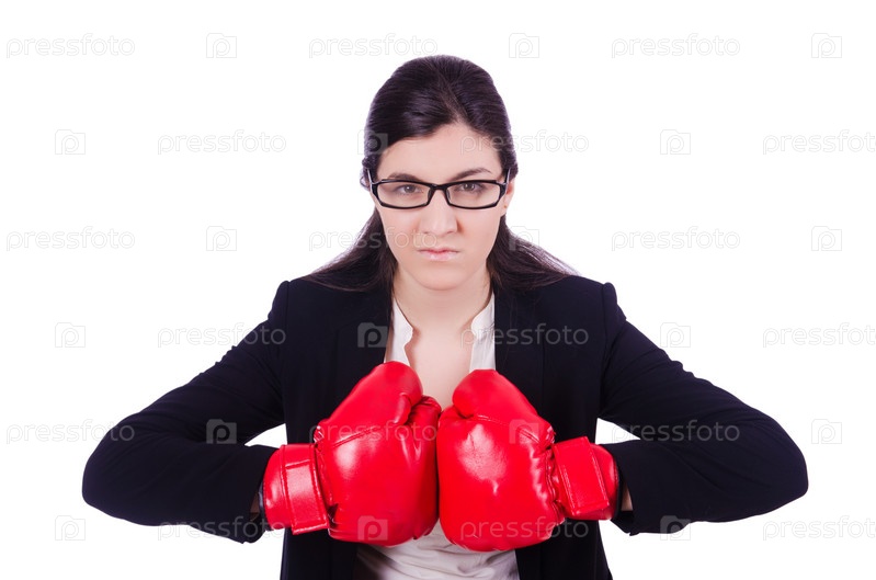 Бизнес-леди с боксерскими перчатками на белом