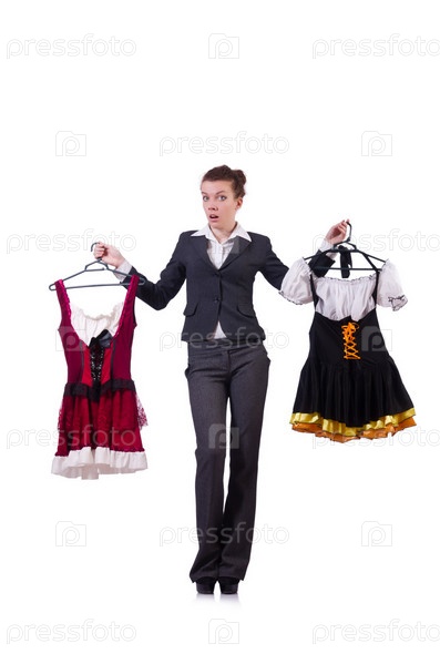 Женщина пытается выбрать платье на белом фоне