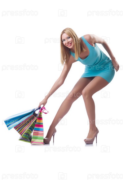 Высокая девушка после хороших шопинга на белом фоне