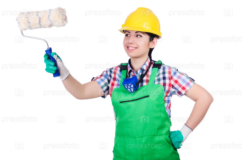 Маляр с кистью на белом фоне