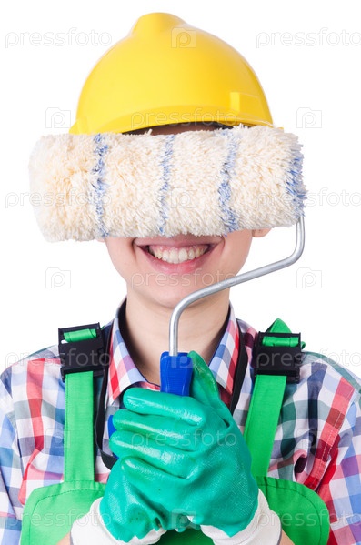 Маляр с кистью на белом фоне