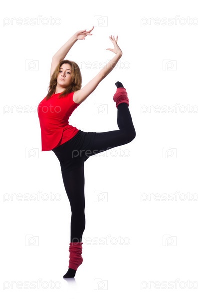 Молодая гимнастка занимается на белом фоне