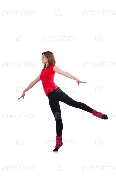 Молодая гимнастка занимается на белом фоне