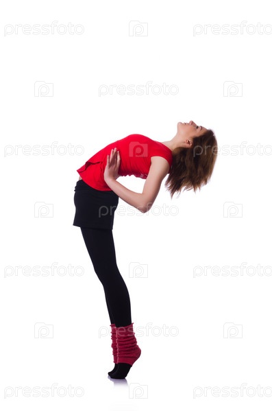 Молодая гимнастка занимается на белом фоне