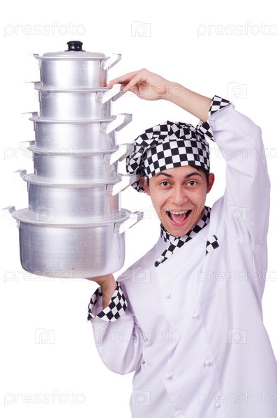 Повар с кастрюлями на белом