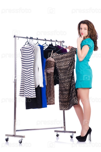 Женщина меряет новую одежду на белом фоне