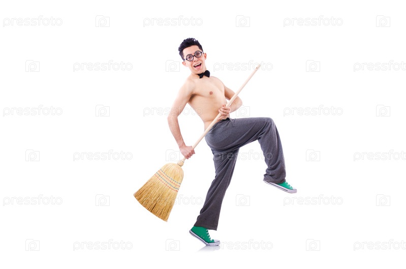 Забавный человек с веником на белом фоне