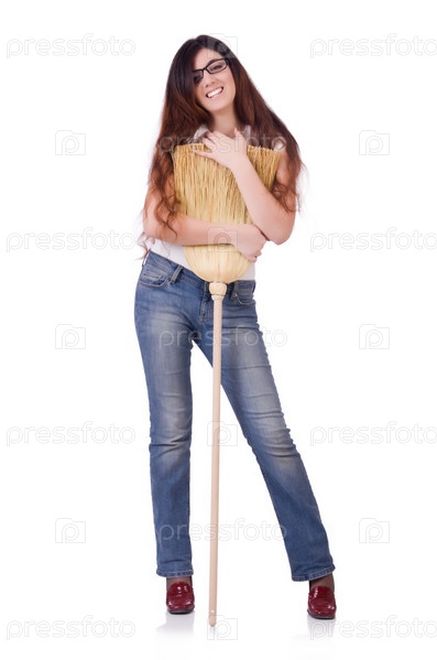 Молодая женщина с веником, изолированная на белом