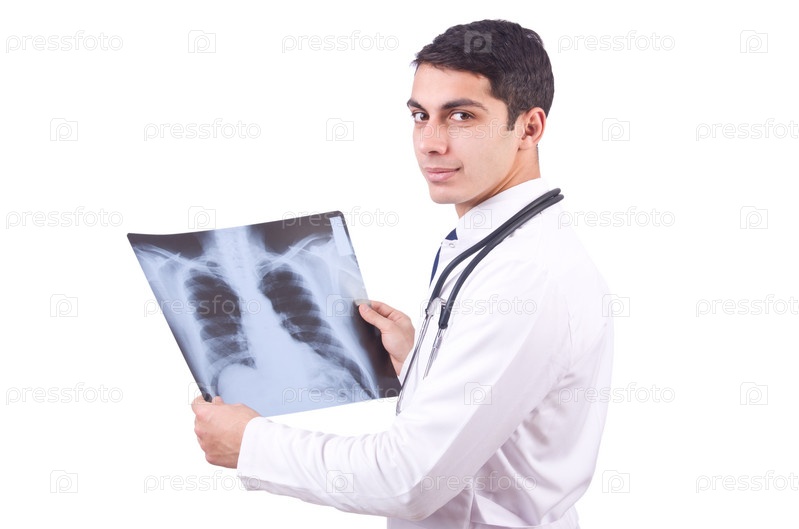 Молодой врач с рентгеновским снимком на белом фоне