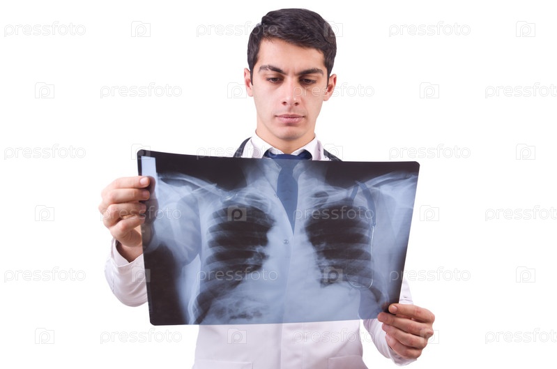 Молодой врач с рентгеновским снимком на белом фоне