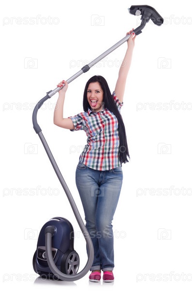 Женщина с пылесосом на белом фоне
