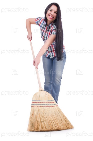 Молодая женщина с веником, изолированная на белом фоне