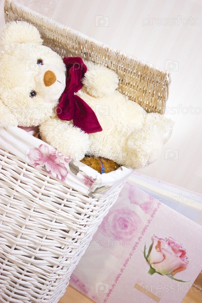 Игрушечный медведь сидит на плетеной корзине