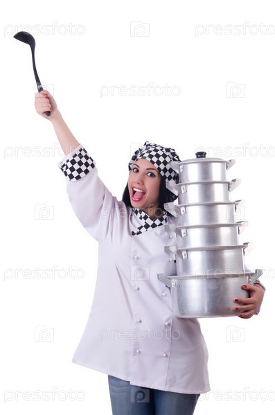 Повар с кастрюлями на белом