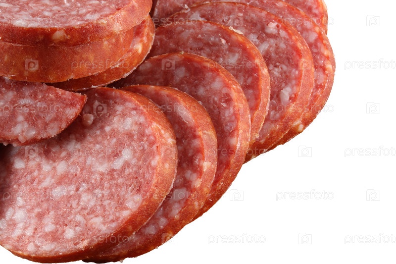 Колбаса, нарезанная тонкими ломтиками, на белом фоне