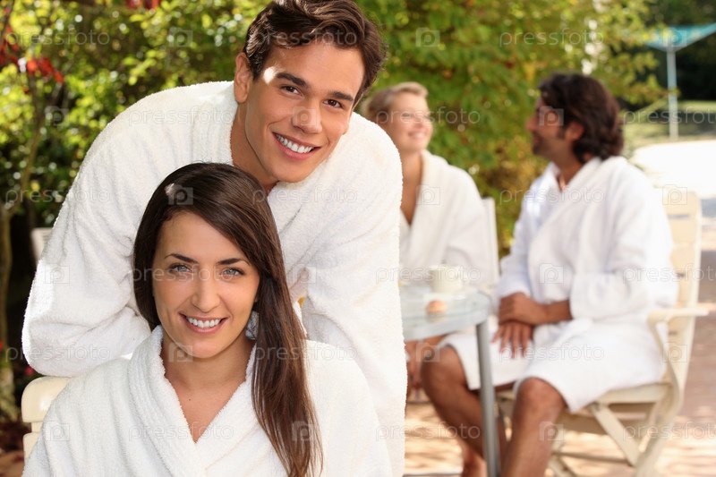 Молодая пара в халатах сидит на террасе с друзьями