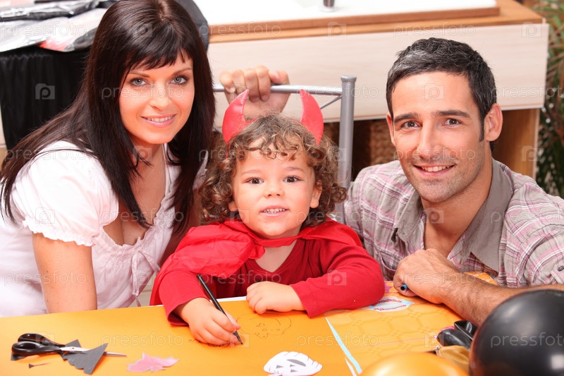 Маленький мальчик и родители готовятся к Хэллоуину