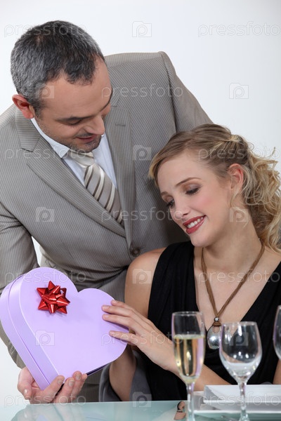Блондинка принимает подарок от мужчины на романтическом ужине