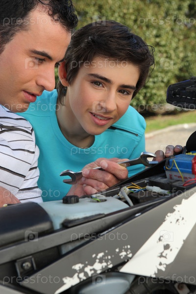 Двое мужчин ремонтируют мотоцикл