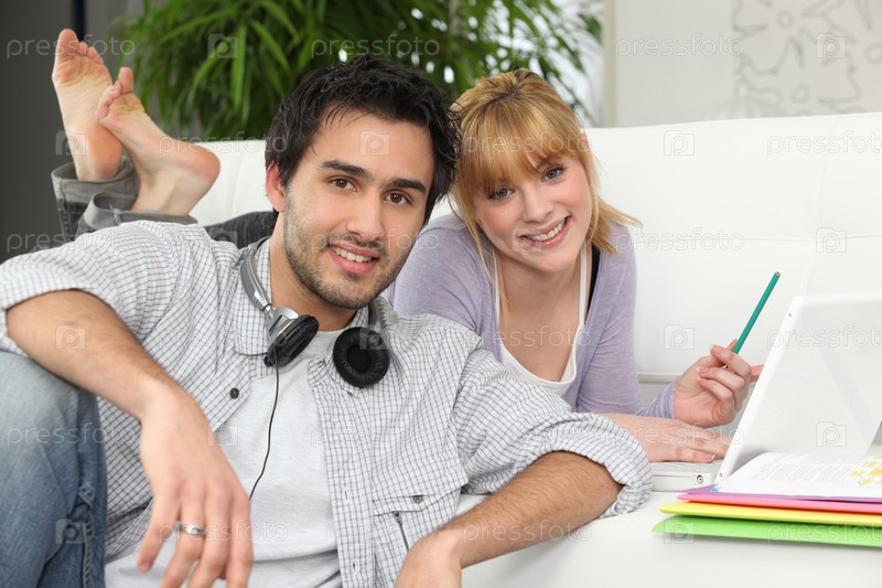 Пара с ноутбуком и наушниками