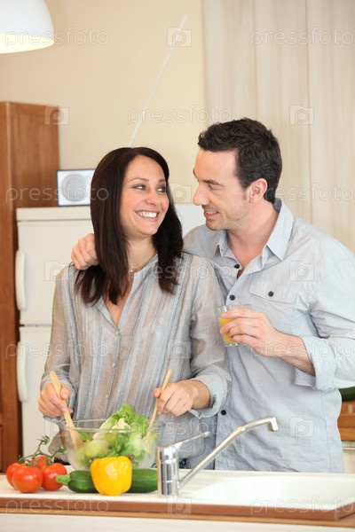 Идеальный домохозяйка готовит блюдо с мужем