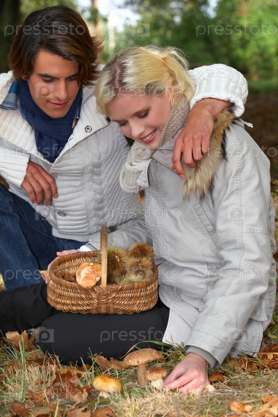 Пара собирает грибы