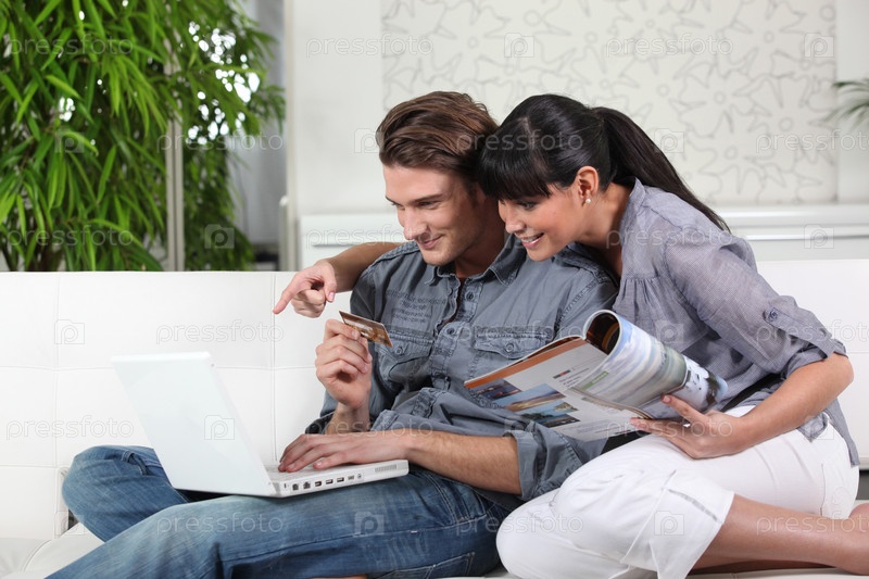 Молодая пара с делает покупки онлайн