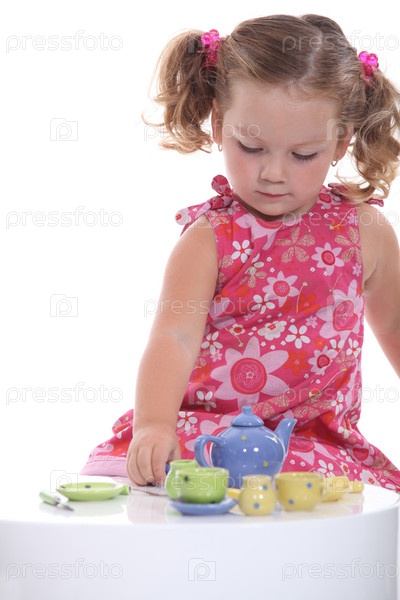 Маленькая девочка играет с детской посудой