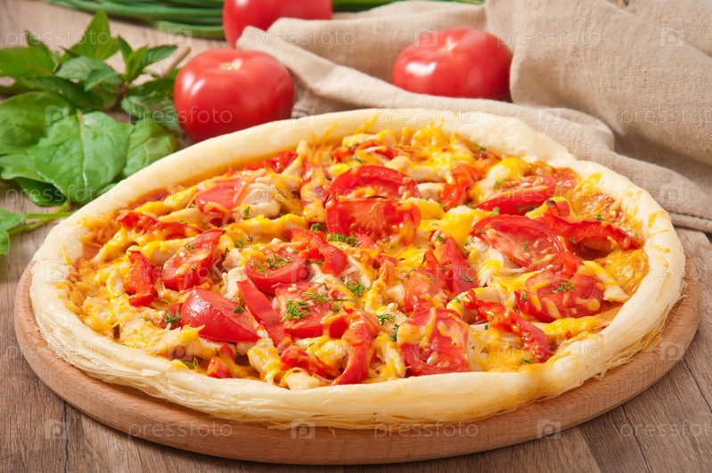 Аппетитная пицца с курицей, помидорами, перцем и сыром