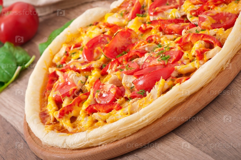 Аппетитная пицца с курицей, помидорами, перцем и сыром