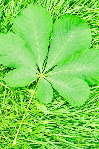 Зеленый лист каштана лежит на траве