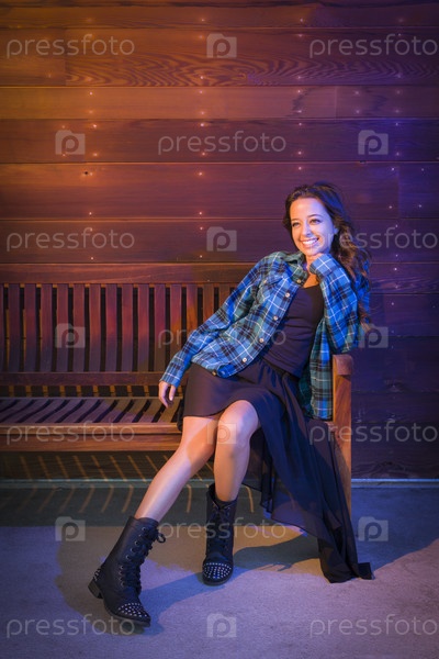 Портрет молодой женщины смешанной расы на деревянной скамейке