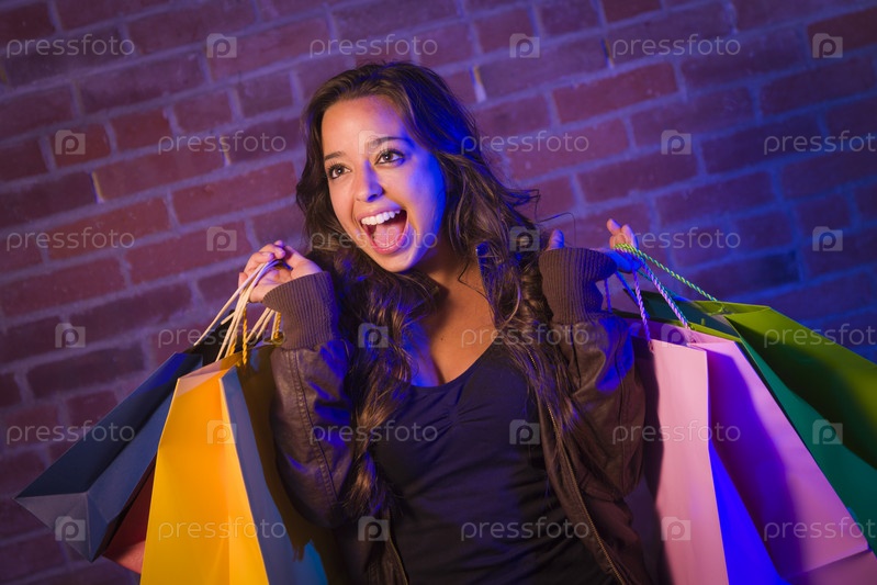 Молодая женщина, держащая сумки, у кирпичной стены