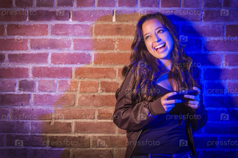 Молодая женщина с телефоном у кирпичной стены