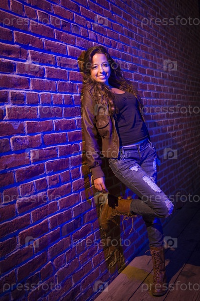 Молодая женщина смешанной расы у кирпичной стены