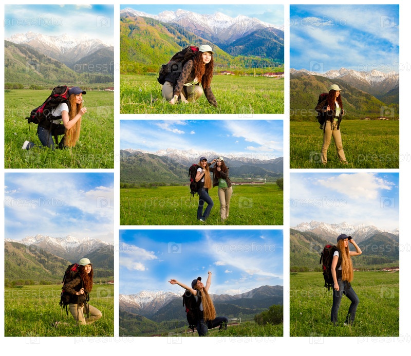 Коллаж, альпинист с рюкзаком в горах, Акбулак, Алматы, Казахстан