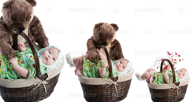 Коллаж, девочка в корзине с игрушечным медведем, изолировано на белом фоне
