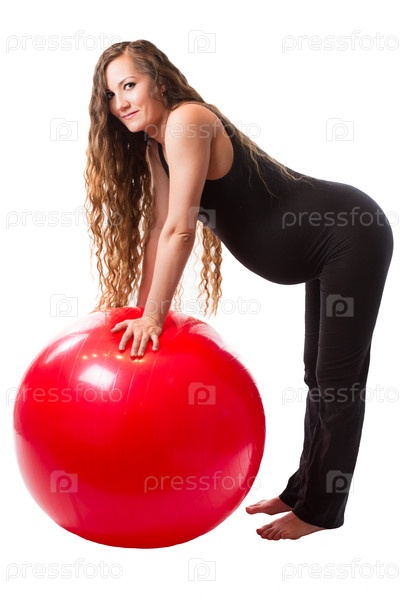 Беременная женщина делает упражнения на фитболе на белом фоне, концепция спорта и здоровья