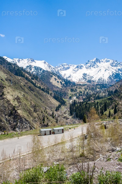 Панорама, зеленые горы, снег и голубое небо в Чимбулаке, Алматы, Казахстан