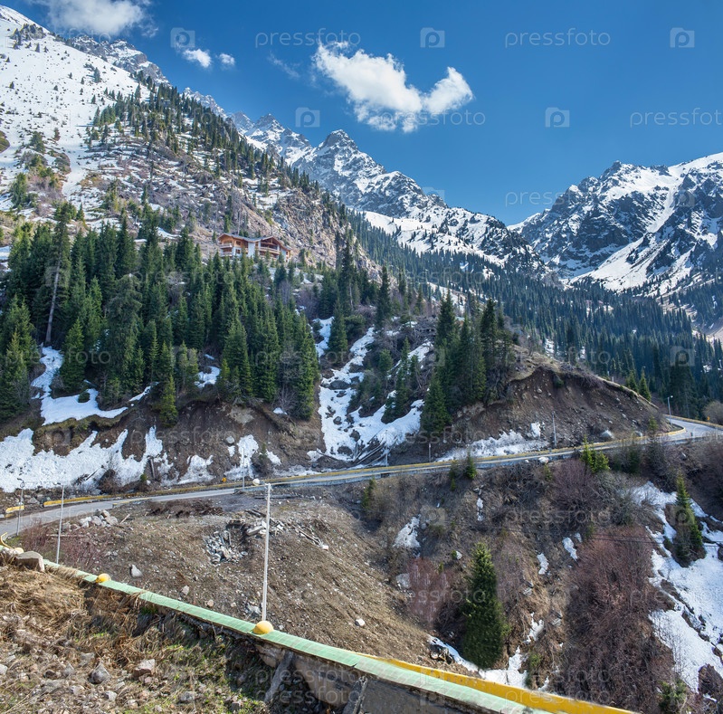 Панорама природы: елки и зеленые горы, снег и голубое небо, Чимбулак, Алматы, Казахстан