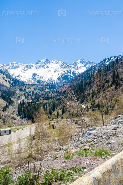 Панорама зеленых гор, снег и голубое небо, Чимбулак, Алматы, Казахстан