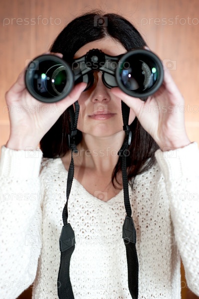 Женщина смотрит через бинокль