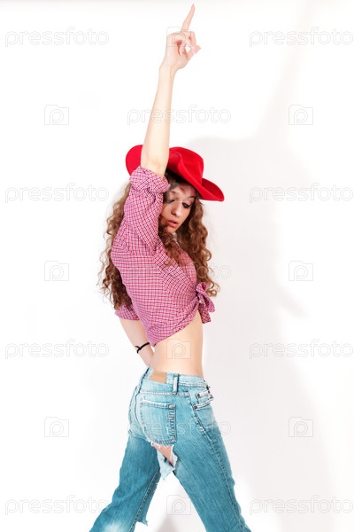 Женщина в красной ковбойской шляпе, джинсах и рубашке