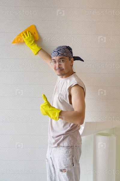 Молодой работник разглаживает обои шпателем