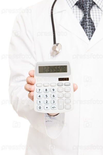 Врач с калькулятором в правой руке показывает сметные расходы и доходы во врачебной практике и оплате больничного лечения