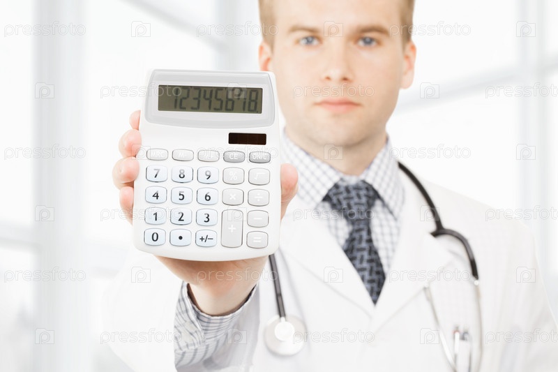 Врач с калькулятором в правой руке показывает сметные расходы и доходы во врачебной практике и оплате больничного лечения