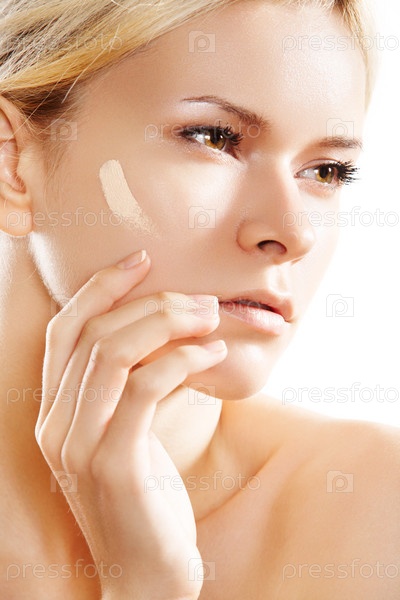 Девушка наносит тональный крем на лицо