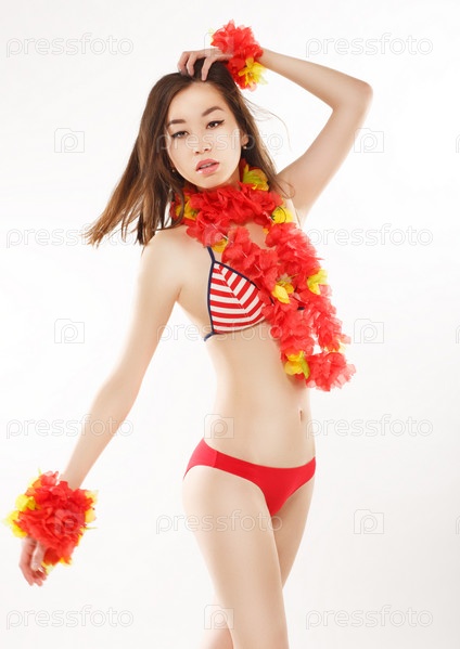 Фантазия. Чувственная японская девушка в красном бикини с цветами