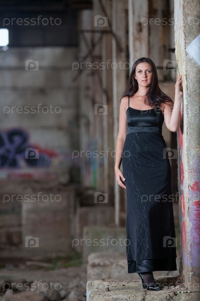 Красивая женщина в длинном черном платье стоит на заброшенном заводебетонный столб