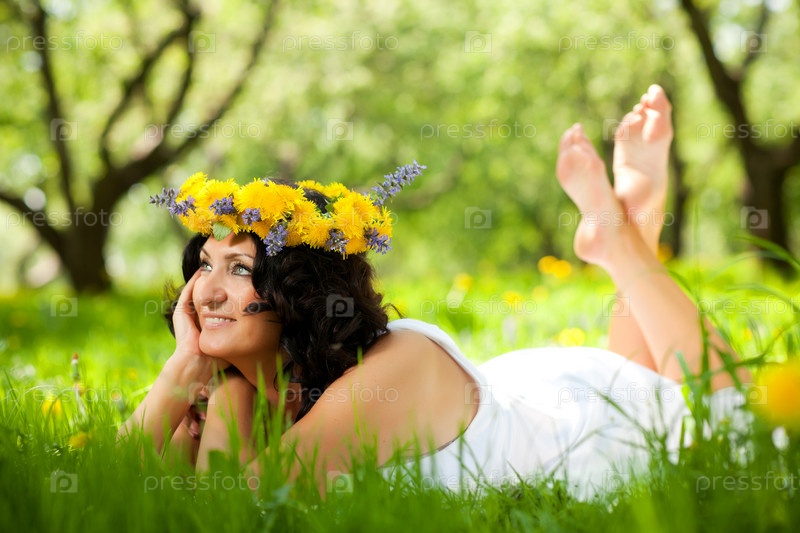 Взрослая красивая женщина с венком из цветов на голове лежит на траве